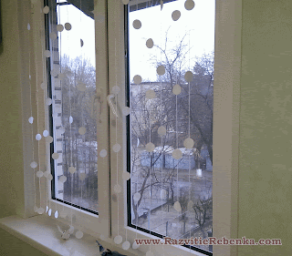 Для начала берем лист бумаги и рисуем много-много кружочков, желательно не очень маленького размера и не сильно большого. Далее вырезаем круги ножницами. Берем белые нитки (мы использовали нитки для вязания). Отрезаем нитки, предварительно измерив размер окна в длину. По всей длине отрезанной нитки приклеиваем кружочки с двух сторон. Кружочки приклеиваем в разном порядке, так будет красивее. Далее прикрепляем к окну. Мы использовали скотч.